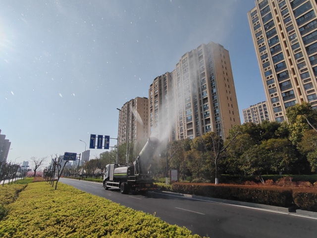 “空中”清洗,“洗”出清新氣。隨著春季氣溫的升高,兩臺搭載大型“霧炮”的多功能抑塵車每天“不辭辛勞”地在園區(qū)主次干道上緩緩行駛,噴射出的水霧在陽光照射下劃出一道道絢麗的彩虹,不僅裝扮了城市之美,更能有效“捕捉”空氣中PM2.5、PM10等懸浮顆粒,使空氣更加清新。