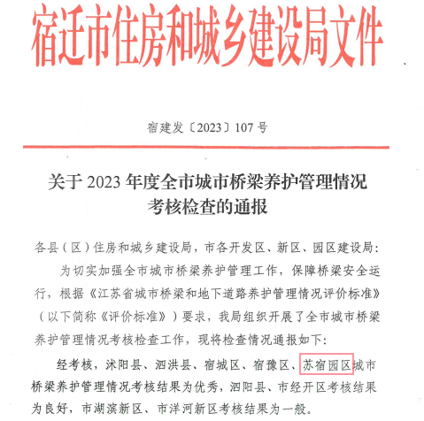 近日,宿遷市住房和城鄉(xiāng)建設局下發(fā)2023年度全市城市橋梁養(yǎng)護管理情況考核檢查通報,園區(qū)城市橋梁養(yǎng)護管理工作再獲佳績。