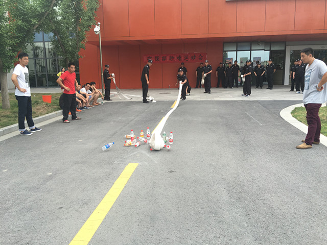 趣味運動會在歡樂的氣氛中進行,趣味運動會項目共有拔河、跳繩、往返跑、消防“保齡球”4個比賽項目。各項比賽都扣人心弦,趣味盎然,精彩場面隨處可見。比賽中每個項目都突出了“樂”字,參賽者“玩”得開心,觀眾看得開心,加油聲此起彼伏,安保人員相互間協(xié)作,共同完成各項比賽。